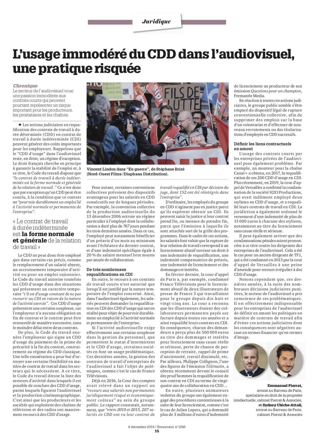 SYDNEY CHICHE-ATTALI & EMMANUEL PIERRAT Le secteur de l’audiovisuel voue une passion immodérée aux contrats courts qui peuvent pourtant représenter un risque important pour les producteurs, les prestataires et les chaînes. Les actions judiciaires en requalification des contrats de travail à durée déterminée (CDD) en contrat de travail à durée indéterminée (CDI) peuvent générer des … Lire la suite de L’usage immodéré du CDD dans l’audiovisuel, une pratique risquée – ECRAN TOTAL