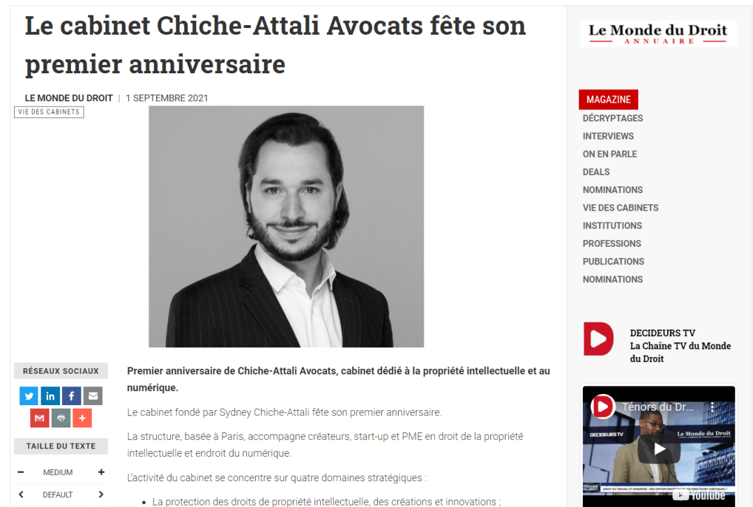 Lien vers l'article Contenu de l'article : "Premier anniversaire de Chiche-Attali Avocats, cabinet dédié à la propriété intellectuelle et au numérique. Le cabinet fondé par Sydney Chiche-Attali fête son premier anniversaire. La structure, basée à Paris, accompagne créateurs, start-up et PME en droit de la propriété intellectuelle et endroit du numérique. L’activité du cabinet se concentre … Lire la suite de Le Monde du Droit célèbre le 1er anniversaire de Chiche-Attali Avocats