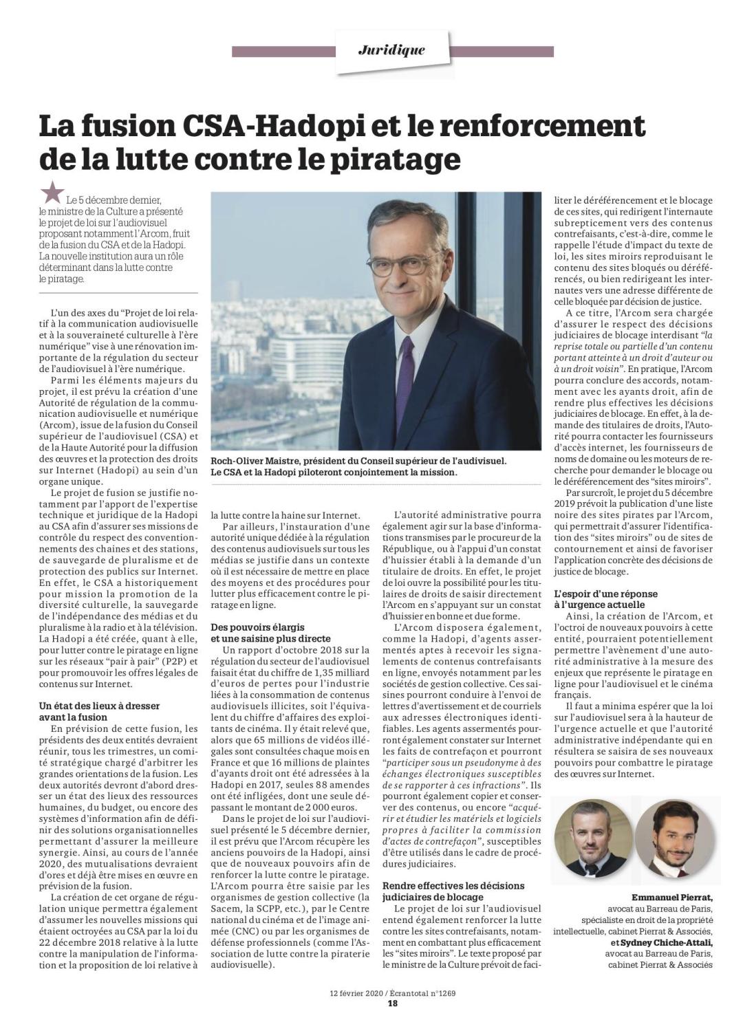 SYDNEY CHICHE-ATTALI ET EMMANUEL PIERRAT Le 5 décembre dernier, le ministre de la Culture a présenté le projet de loi sur l’audiovisuel proposant notamment la fusion du CSA et de la HADOPI en un organe qui aura un rôle déterminant dans la lutte contre le piratage, l’ARCOM. L’ARCOM, fusion du CSA et de la HADOPI L’un … Lire la suite de La fusion CSA / HADOPI et le renforcement de la lutte contre le piratage – Ecran Total