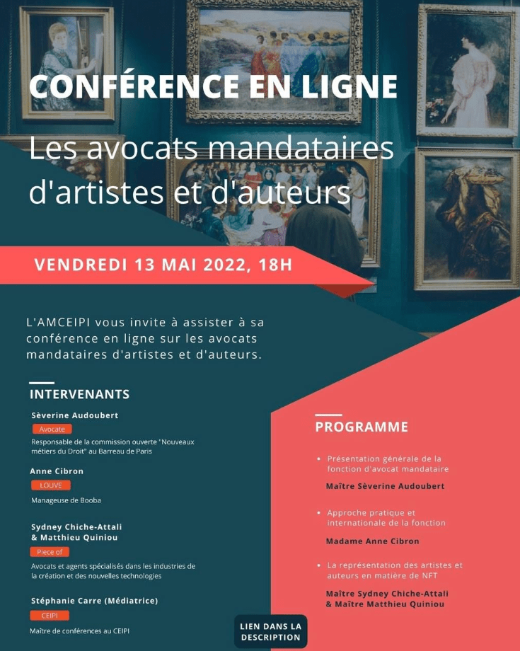 Intervention sur l’activité d’avocat mandataire d’artistes et d’auteurs NFT – Centre d’études internationales de la propriété intellectuelle (CEIPI) – 13 mai 2022